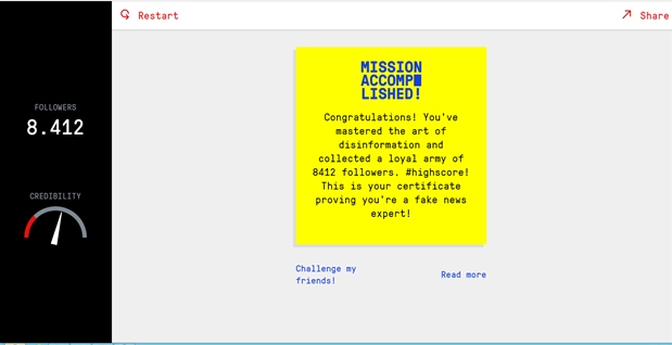 This game was about gaining followers inside the game through six different tactics by posting fake news on the web. Based on my experience, it was amusing being a fake news writer and posting fake news on the web and playing together with my classmates. I know it is wrong and against my moral values but still enjoyed this game because of the challenge to increase your followers. As I played the game, I have encountered different posts suggested by the narrator of the game to help me to be a better fake news writer. The narrator also asked me several questions about my insights on posts that will be more trending in the social media world. I am also glad that the social media platform, Twitter was used a medium to spread fake news on people. It was funny to see Donald Trump and impersonate him to spread fake news. This game was also mind blowing for me because the question in the early part of game was useful in the later part for you to gain more followers. I highly recommend this game to be played by my fellow students in the whole world because it may and can help you to spot a fake news post in the reality. This is because of the reason that you have already experienced on how to be a fake news writer, that is why with this kind of game developed by researchers in University of Cambridge, I can assure you that this game will teach people to better identify fake news. People will be more alert and aware because of this. Below you can see my badges and the number of followers that you will also encounter in the game. I only got almost 8,500 followers but I bet that you can earn more. GOOD LUCK!